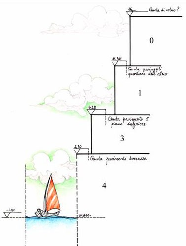 The level of the Villa studied in the 18th century stands at an altitude of 11 metres. Since the ancient ground level was about 5 metres deeper, we should fix the height of the main floor in antiquity at 16 metres above sea level. Our study has brought to light no fewer than four architectural levels underneath the main floor, with progressively smaller frontage in order to accommodate the slope. Their configuration suggests a predominantly residential use.